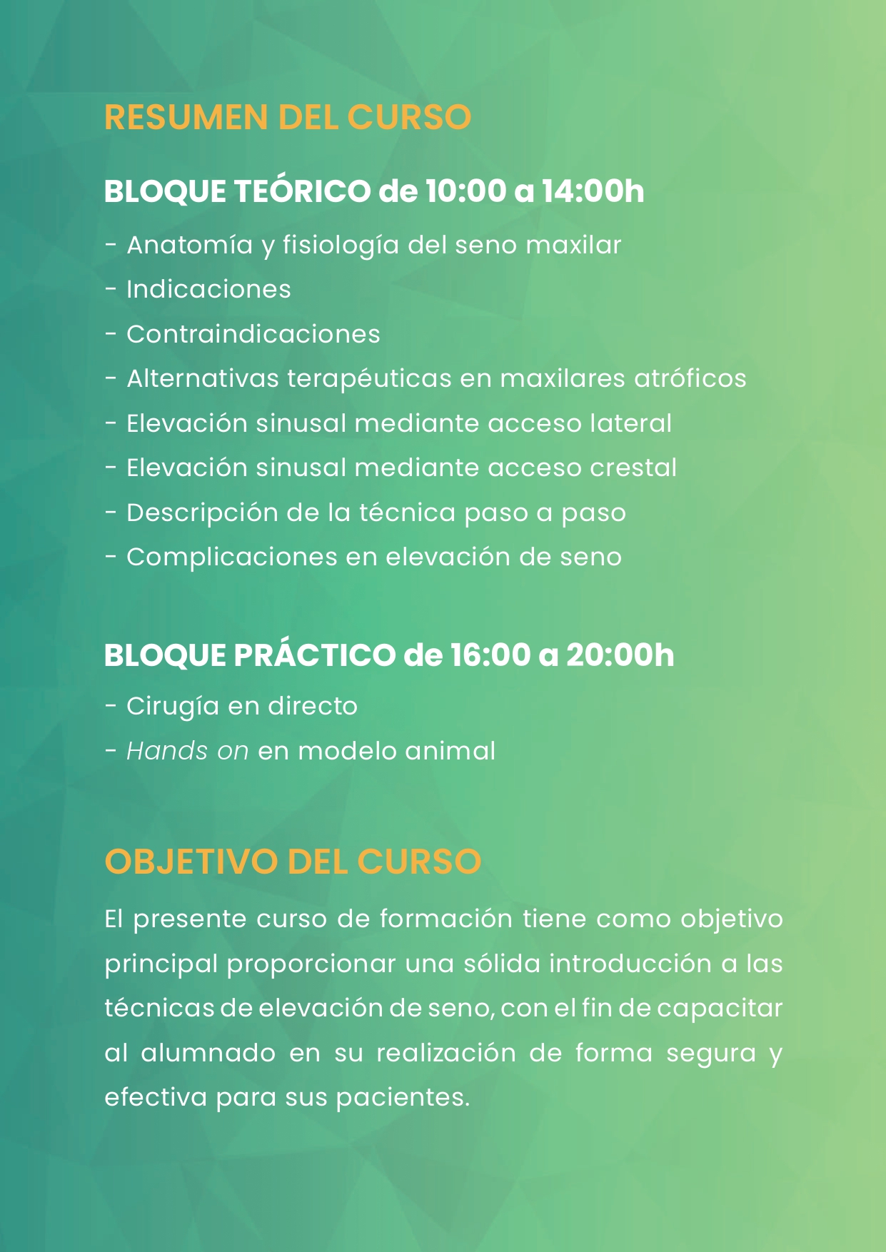 El presente curso de formación tiene como objetivo principal proporcionar una sólida introducción a las técnicas de elevación de seno, con el fin de capacitar al alumnado en su realización de forma segura y efectiva para sus pacientes.